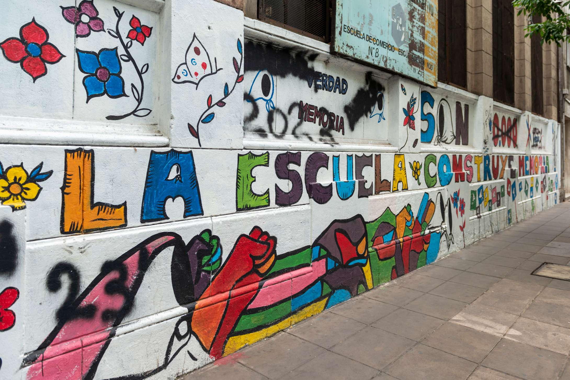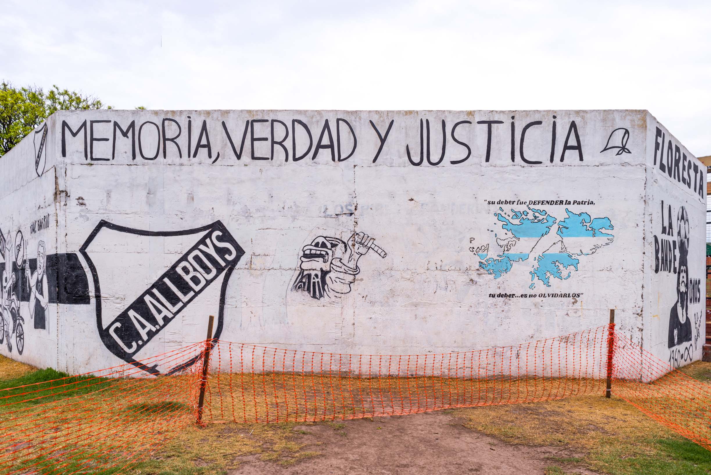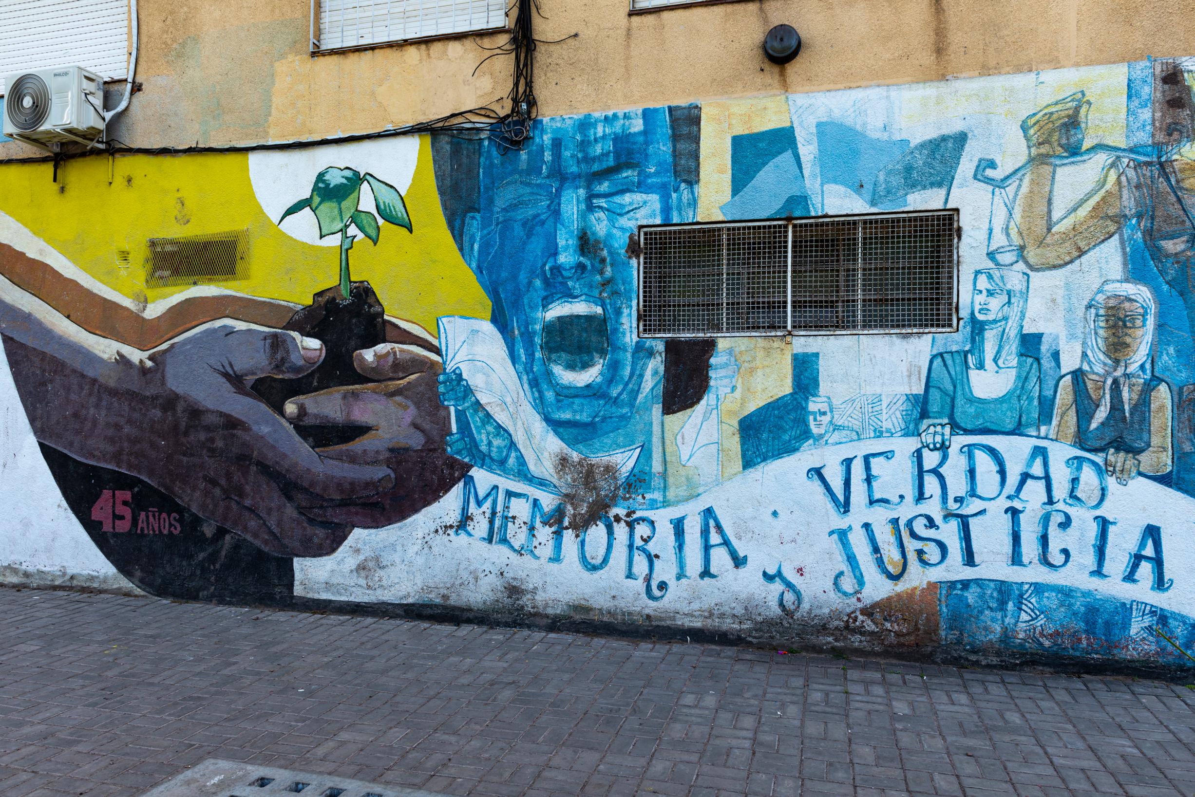 El mural “Memoria, Verdad, Justicia” fue inaugurado en marzo de 2021 y lleva las firmas de la Comisión de Derechos Humanos de Argentinos Junios y de los Muralistas de la Paternal.