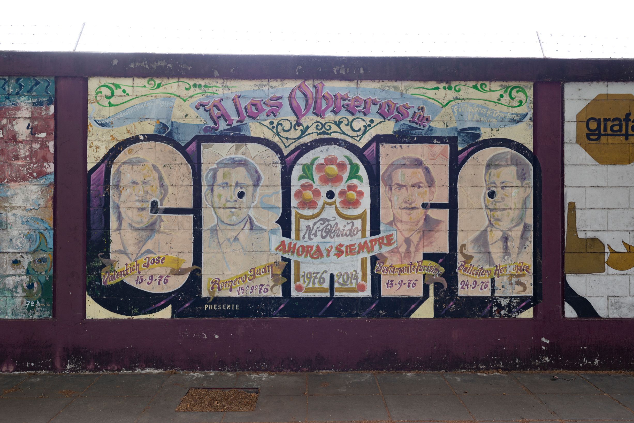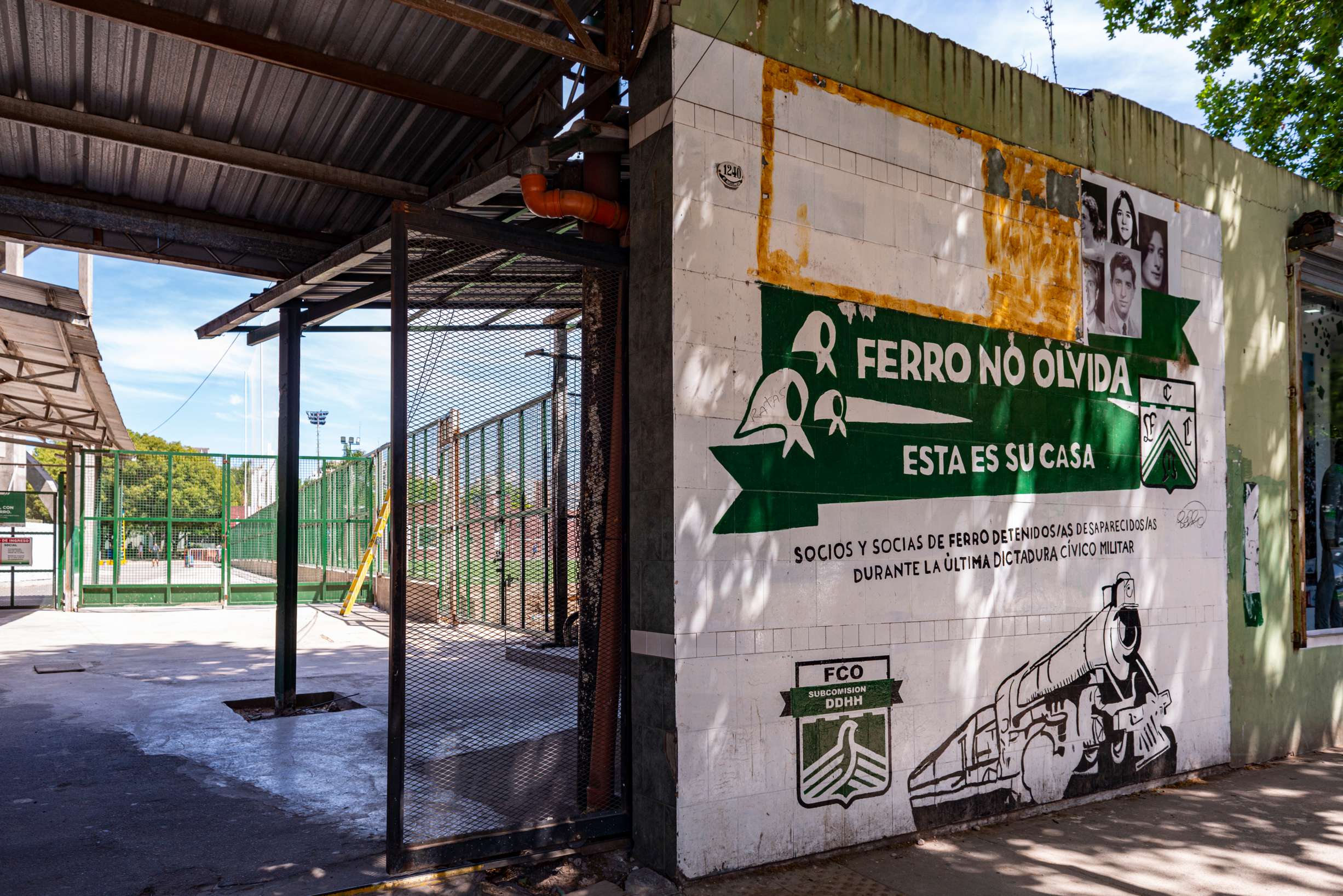En la entrada al estadio de Ferrocarril Oeste un mural y tres baldosas recuerdan y homenajean a 16 socios y socias desaparecidas durante la última dictadura cívico militar. "Este es un acto de reparación de memoria histórica en nuestro club, donde 16 socios y socias que tenían sueños, proyectos, historia, amores y una esperanza de país justo, forman tristemente parte de los 30.000 que nos faltan a todos; son parte de la familia del club Ferro Carril Oeste y nos los arrancaron".