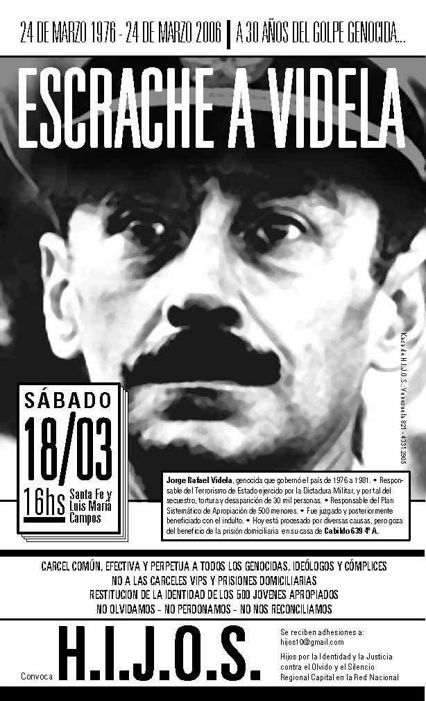 El sábado 18 de marzo de 2006, a pocos días del 30 aniversario del del último golpe militar, se realizó el escrache contra el genocida Jorge Rafael Videla, que en ese momento vivía bajo arresto domiciliario. El evento fue organizado por la agrupación H.I.J.O.S y contó con el apoyo de las asociaciones Madres de Plaza de Mayo, Línea fundadora y Abuelas de Plaza de Mayo. La convocatoria fue masiva y sumó más de 10000 manifestantes que marcharon a lo largo de 7 cuadras de la Avenida Cabildo.